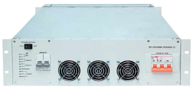 Тиристорный быстродействующий байпас BP-110/380B-75000BA-3U разработан для параллельного включения до 30 инверторов 2500ВА с входным напряжением 110В, которые выполняют важную роль в обеспечении стабильного электропитания для электронных устройств и телекоммуникационных систем. Также осуществляют непрерывную подачу электроэнергии трехфазным переменным напряжением 380В. Полная мощность составляет 75 кВА и активная мощность составляет 75 кВт.