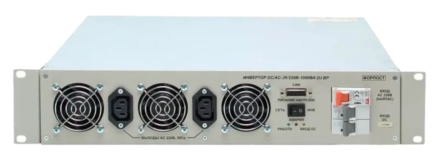 Инвертор DC/AC-24/220B-1500BA-2U ВР обеспечивает надежное электропитание телекоммуникационного оборудования и различной электронной аппаратуры, которые потребляют мощность не более 1500 ВА (или 1000 Вт), преобразуя постоянный ток с номинальным напряжением 24 В в переменный ток высокого качества 220 В при частоте 50 Гц.