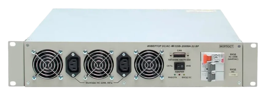 Инвертор DC/AC-48(60)/220B-3000BA-2U BP обеспечивает надежное электропитание телекоммуникационного оборудования и различной электронной аппаратуры, которые потребляют мощность не более 3000 ВА (или 2000 Вт), преобразуя постоянный ток с номинальным напряжением 48(60) В в переменный ток высокого качества 220 В при частоте 50 Гц.